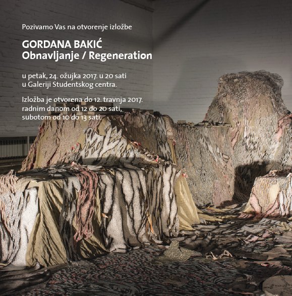 Otvorenje izložbe Obnavljanje Gordane Bakić u petak, 24. ožujka 2017. u 20 sati u Galeriji SC. Izložba je otvorena do 12. travnja 2017. radnim danom od 12 do 20 sati, subotom od 10 do 13 sati.