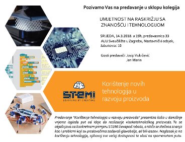 Predavanje “Korištenje tehnologija u razvoju proizvoda” prezentira kako u današnje vrijeme izgleda put od ideje do realizacije visokotehnološkog proizvoda. To se objašnjava na konkretnom primjeru STEMI hexapod robota, a ističu se stečena znanja kao i problemi koji su predavačima zadavali glavobolje ali bili izazov. Naglasak je na korištenju tehnologija, njihovoj sve većoj dostupnost te ulozi na spomenutom putu.