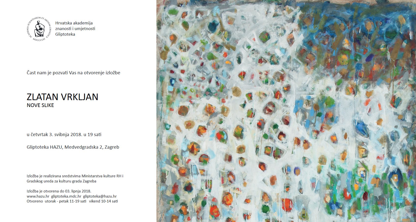 Otvorenje izložbe Zlatana Vrkljana pod nazivom NOVE SLIKE u četvrtak, 3. svibnja 2018. u 19 sati u Gliptoteci HAZU, Medvedgradska 2, Zagreb. Izložba je otvorena do 3. lipnja 2018.