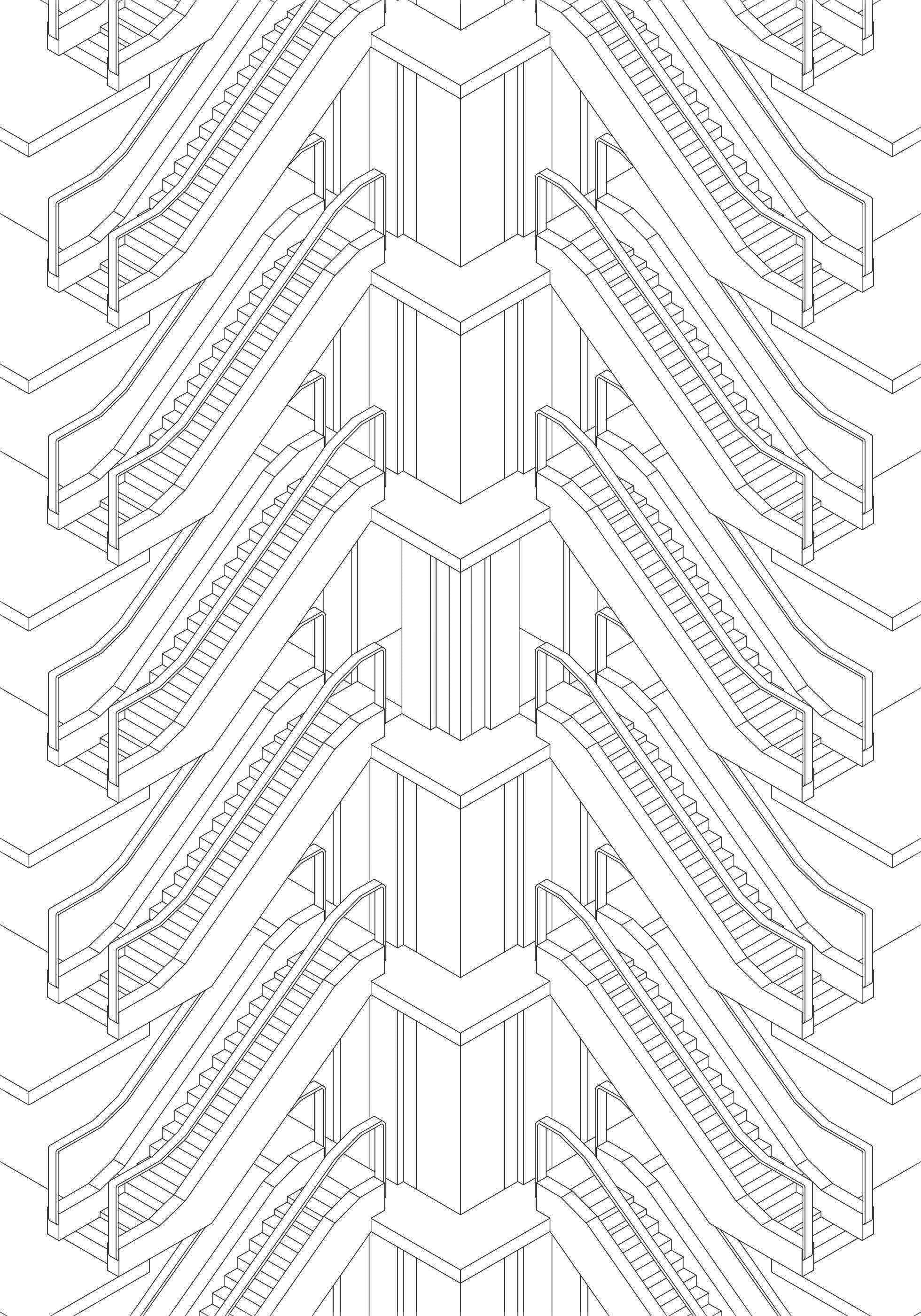 Aksonometrijska projekcija, u ovom slučaju izometrija, definira međuodnos svih ovih proizvoda čime se kreiraju prostorni uzorci ili patterni koji istovremeno prikazuju i beskonačnost i ne-mjesnost, a nastoje indirektno sugerirati ideju sustavnog uspostavljanja reda i društvenog prilagođavanja unutar istih.