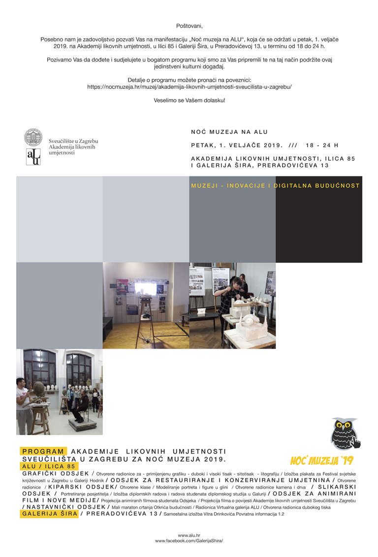 Poštovani, posebno nam je zadovoljstvo pozvati Vas na manifestaciju „Noć muzeja na ALU“, koja će se održati u petak, 1. veljače 2019. na Akademiji likovnih umjetnosti Sveučilišta u Zagrebu, u Ilici 85 i Galeriji Šira, u Preradovićevoj 13, u terminu od 18 - 24 h.