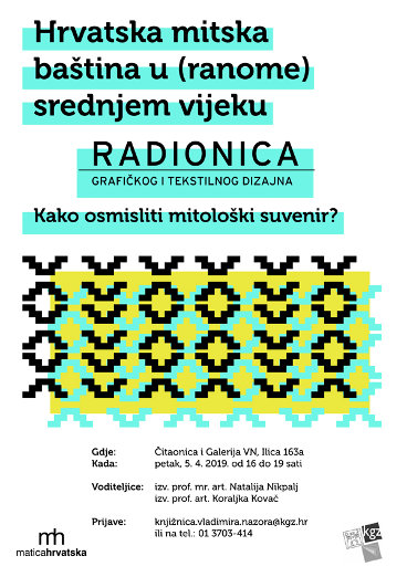 Radionica grafičkog dizajna Kako osmisliti mitološki suvenir? osmišljena je u sklopu programa Matice Hrvatske i Knjižnice Vladimira Nazora Hrvatska mitska baština u ranome srednjem vijeku. U drugom ciklusu podtema je Mitološka simbolika boja, pa će tako polaznici imati prilike upoznati se s kontekstom, značenjem i komunikacijskom ulogom boje u osmišljavanju i oblikovanju mitološkog suvenira. Polaznici će oblikovati nove motive na osnovi grafičkih i trodimenzionalnih predložaka tradicijske baštine (motivi s nošnji, stećaka, kamenih reljefa te drugih tekstilnih izvora) iz kojih bi se mogli razviti i novi proizvodi - suveniri.