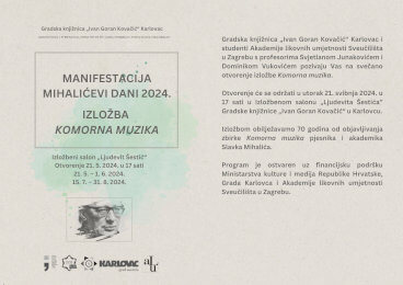 Gradska knjižnica „Ivan Goran Kovačić“ Karlovac i studenti Akademije likovnih umjetnosti Sveučilišta u Zagrebu s profesorima Svjetlanom Junakovićem i Dominikom Vukovićem pozivaju Vas na svečano otvorenje izložbe „Komorna muzika“. Otvorenje će se održati u utorak 21. svibnja 2024. u 17 sati u Izložbenom salonu „Ljudevita Šestića“ Gradske knjižnice „Ivan Goran Kovačić“ u Karlovcu.