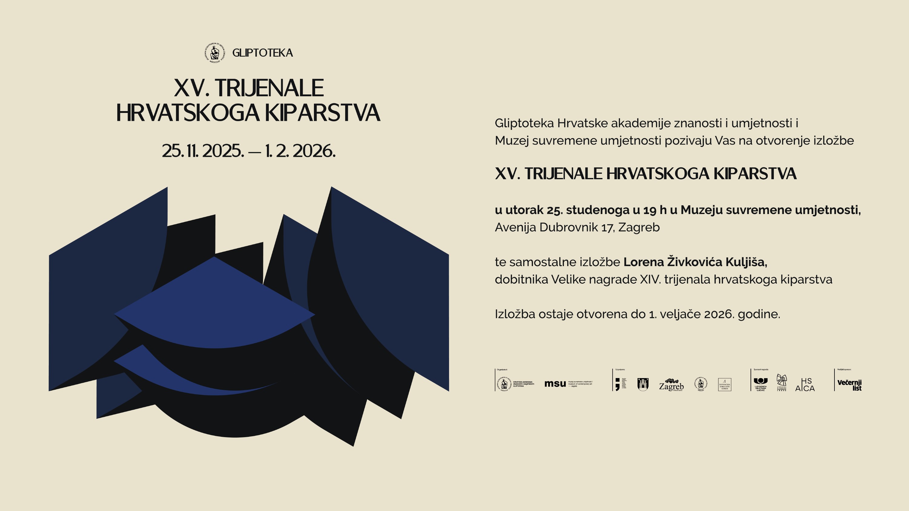 Gliptoteka Hrvatske akademije znanosti i umjetnosti poziva Vas na otvorenje izložbe „XV. trijenala hrvatskog kiparstva“, koje će se održati u utorak, 25. studenoga 2025. godine u 19:00 sati u Muzeju suvremene umjetnosti, Avenija Dubrovnik 17, Zagreb.