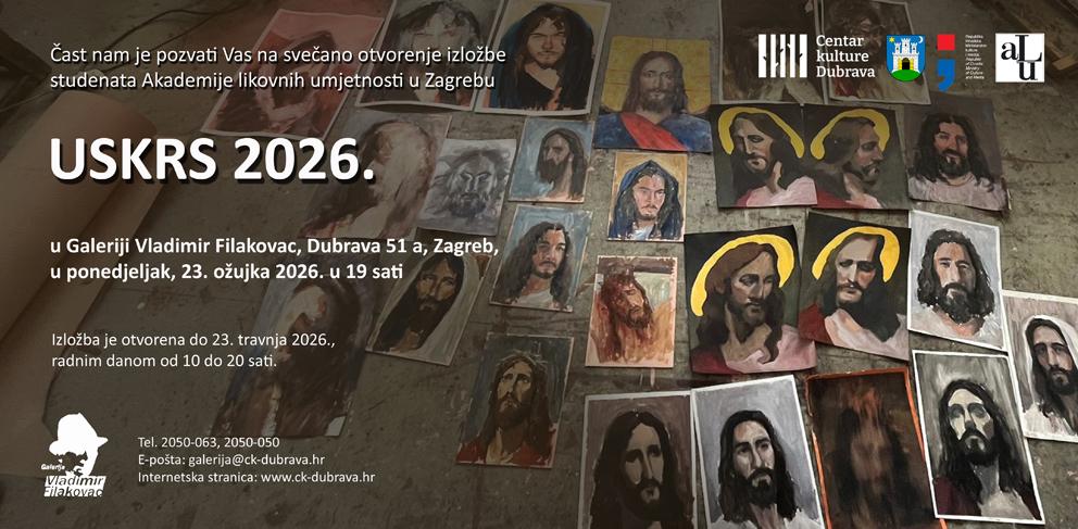 Čast nam je pozvati Vas na svečano otvorenje izložbe studenata Akademije likovnih umjetnosti u Zagrebu "Uskrs 2026" u Galeriji Vladimir Filakovac, Dubrava 51 a, Zagreb, u ponedjeljak 23. ožujka 2026. u 19 sati.