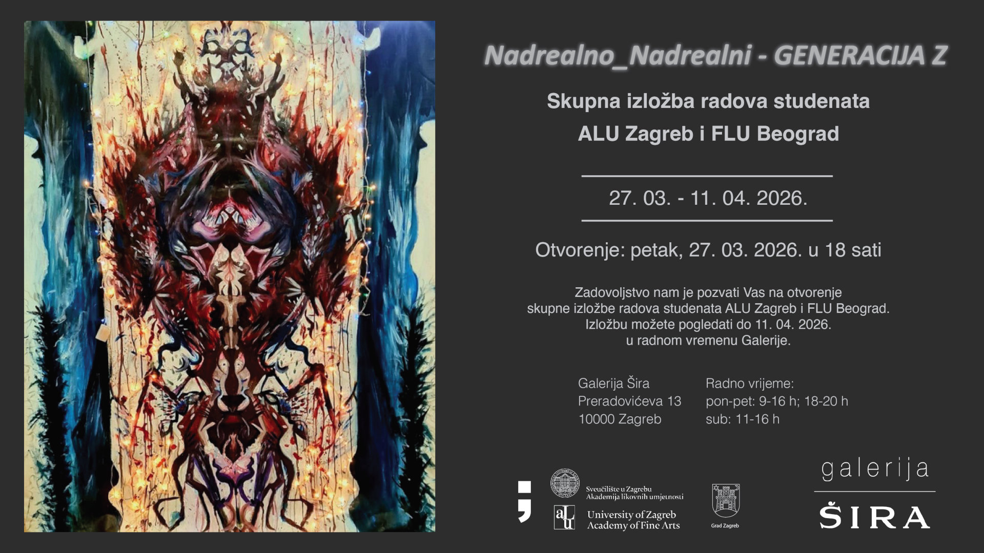 Zadovoljstvo nam je pozvati Vas na otvorenje skupne izložbe radova studenata Akademije likovnih umjetnosti Sveučilišta u Zagrebu i Fakulteta likovnih umetnosti Univerziteta umetnosti u Beogradu pod nazivom "Nadrealno_ Nadrealni – GENERACIJA Z”, koje će se održati u petak, 27.03.2026. godine, u 18 h, u galeriji Šira.